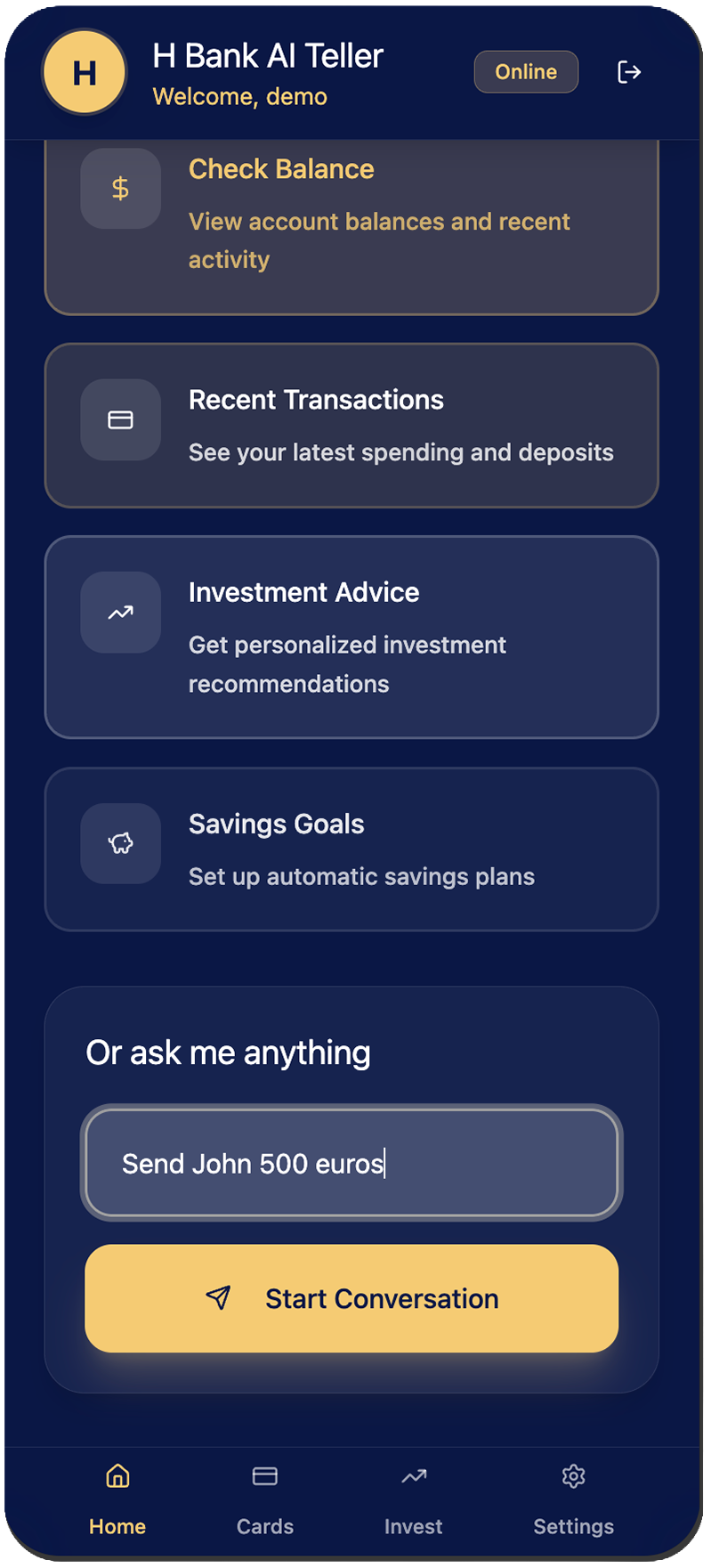 It was already a working prototype with functional login form and working AI teller console, which answered my transaction request and opened a transaction page.