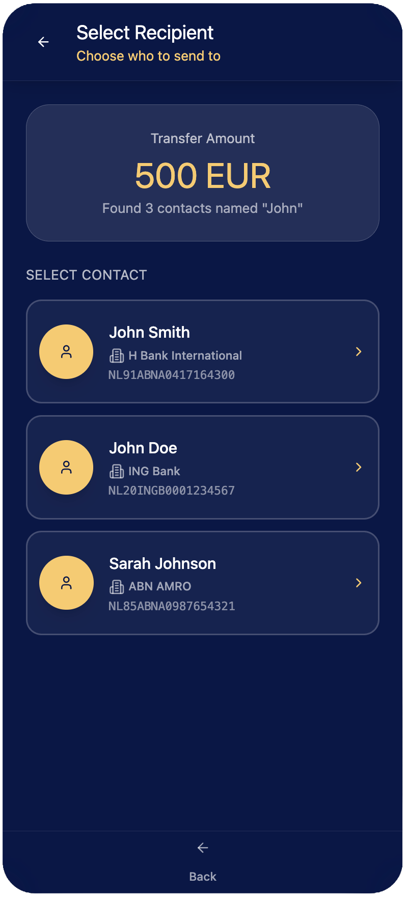 In the next iteration I dealt with one of the ambiguities I presumed and prompted Figma Make to design to direct the user to choose from multiple results. Taking the transfer flow, I added the step for selecting the recipient where the user prompt hit multiple results. Then the agent would bring up the necessary UI for the user to either quickly select the right option for agent to create the right transfer details.